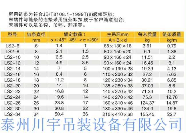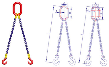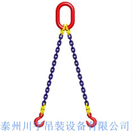 双腿链条成套索具是由高强链条、吊环及末端件组合而成,可以作为双肢捆绑索具使用,当双肢捆绑索具使用时只需将吊钩钩入链条,此时额定载荷将降低20%。